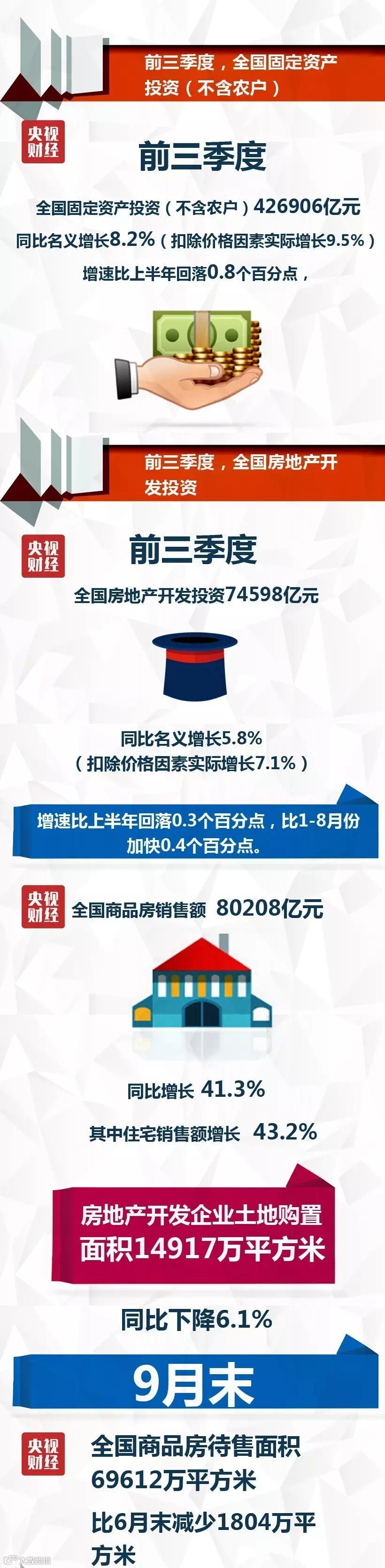 前三季度,全国固定资产投资(不含农户)426906亿元,同比名义增长8.2%(扣除价格因素实际增长9.5%),增速比上半年回落0.8个百分点,但7月、8月和9月当月投资分别增长3.9%、8.2%和9.0%,增速连续2个月加快。