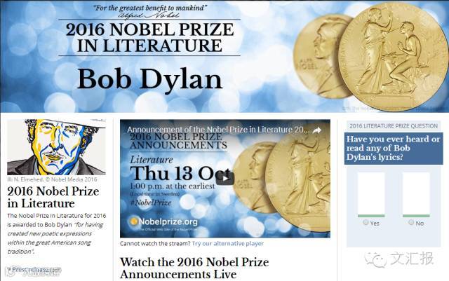 据诺贝尔奖官网最新消息,瑞典斯德哥尔摩当地时间13日下午1时,2016年诺贝尔文学奖揭晓,美国民谣诗人鲍勃·迪伦荣获该奖项。