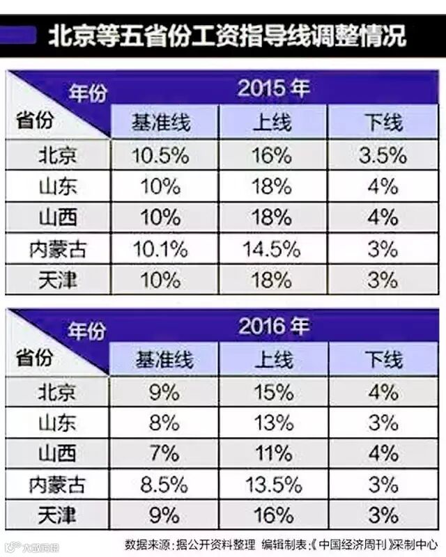 记者从北京等五省份发布的工资指导线看到,在基准线方面,五个地区的基准线均低于10%,而且较2015年的平均水准均有所下降。天津从10%降为9%,北京从10.5%降为9%,山东从10%降为8%,山西从10%降为7%,内蒙古从10.1%降为8.5%。其中,山西降幅最大,达3%。