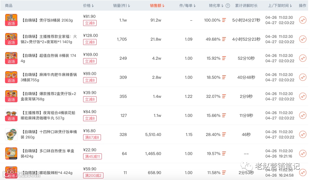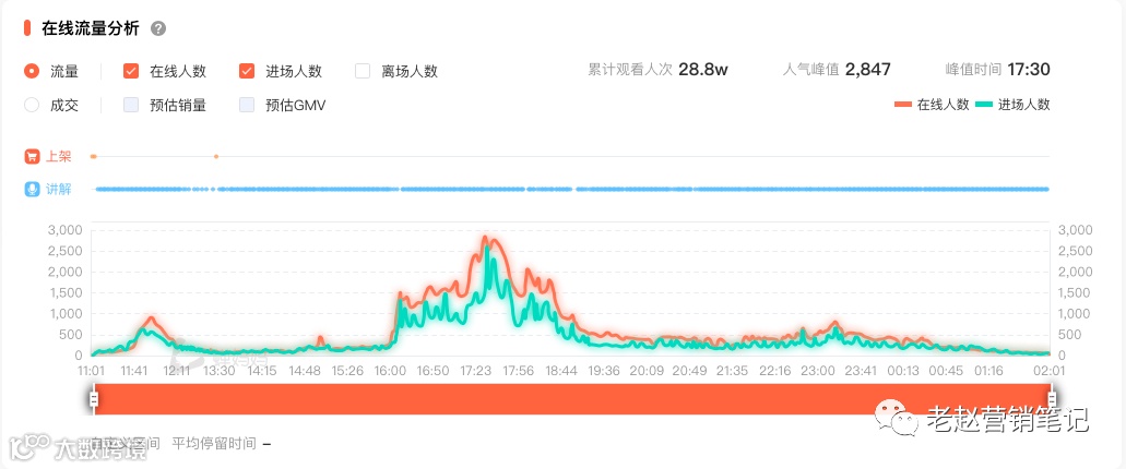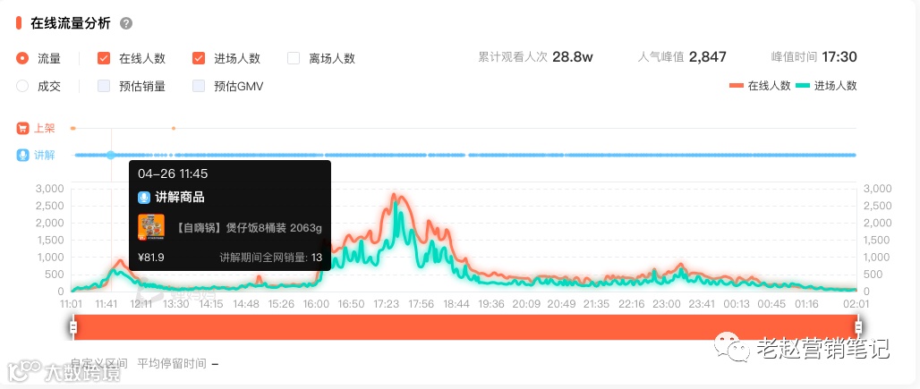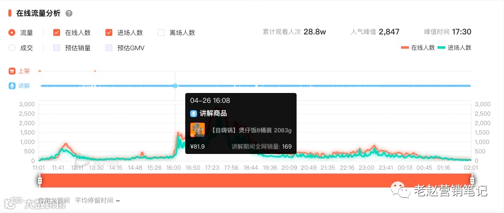 从而这张在线流量分析图和上面的流量占比图中,我们可以分析出自嗨锅是主要是通过短视频投放向直播间引流的。前面已经讲过了短视频和直播的共振配合,这里老赵主要讲一下投放时间点和排品的配合。