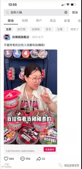 5)我们再纵向看【自嗨锅】这个关键词的搜索结果,搜索结果首先是自嗨锅旗舰店,第二位和第三位是自嗨锅之前投过的达人短视频,对于消费者进入直播间或者购买自嗨锅的产品也是非常有帮助的。