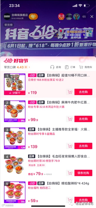 从上面几个维度看,自嗨锅的产品非常适合抖音自播。无论从品类、品牌、单价、内容呈现形式、优惠策略还是以往的全网销量考量,自嗨锅的产品都符合抖音爆款的特性,是自嗨锅直播间起量的基础。