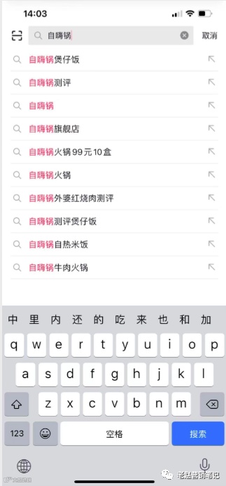 2)系统会整理用户的搜索需求,把搜索指数比较高的词在下拉框里推荐给用户,比如我们搜索自嗨锅,下面出现的词就是有用户需求的关键词;这些词我们可以记录下来用于短视频制作植入和直播投放使用。