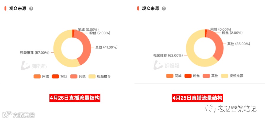 由于我们拿不到自嗨锅旗舰店的百应后台,我们只能用蝉妈妈上的数据做一些基本的判断。我们先看两张自嗨锅月销超过百万 GMV 直播的流量结构和一张在线流量分析图: