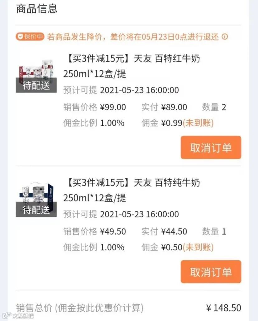 她说这还算好的,5月底有顾客买了三箱牛奶,总价148.5元,提成只有1%,实际到她手的只有1.5元不到。