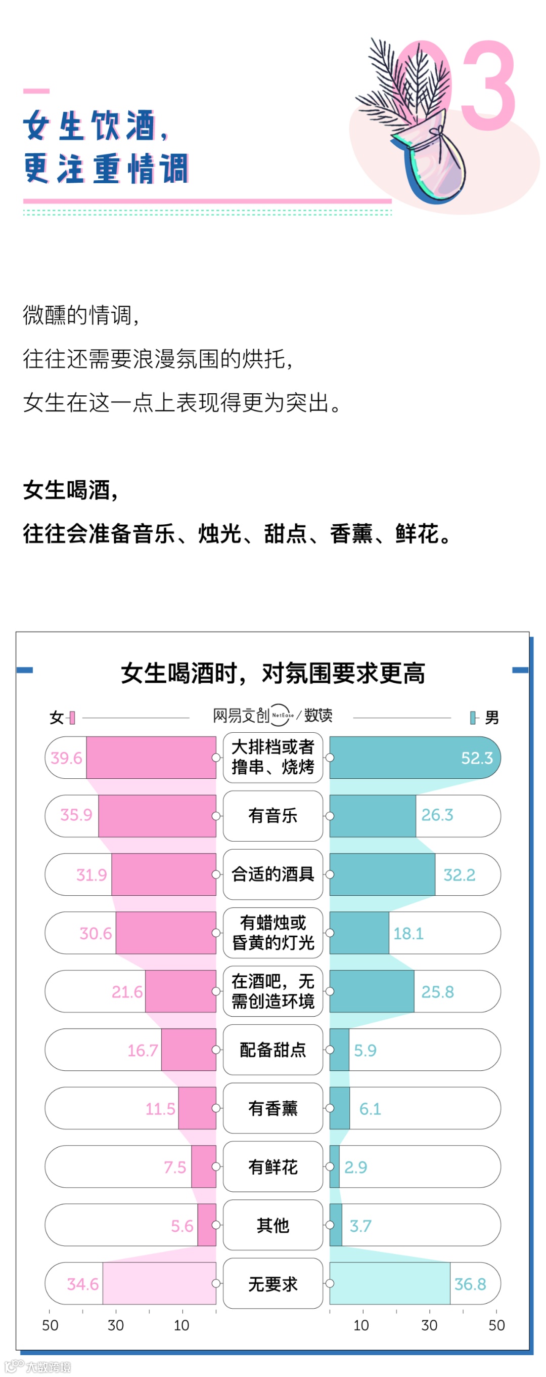 5. 女生饮酒注重情调,准备音乐、蜡烛、甜点、香薰、鲜花的比例要远大于男生。