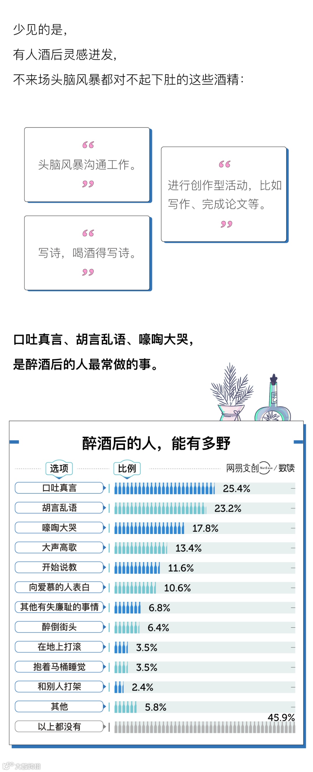 7. 超一半的人曾在酒后发过酒疯,其中口吐真言、胡言乱语、嚎啕大哭最为常见。