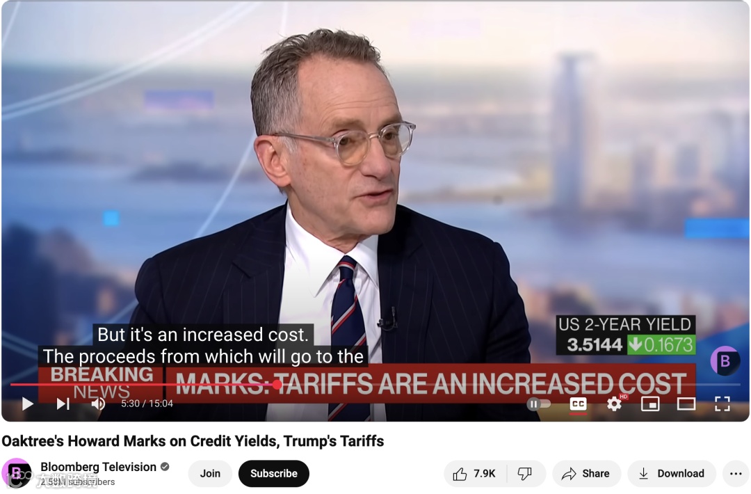 4 月 4 日 , 橡树资本(Oaktree Capital)的联席创始人霍华德·马克斯(Howard Marks)接受彭博社的采访,讨论了特朗普政府关税对经济和金融市场的影响。