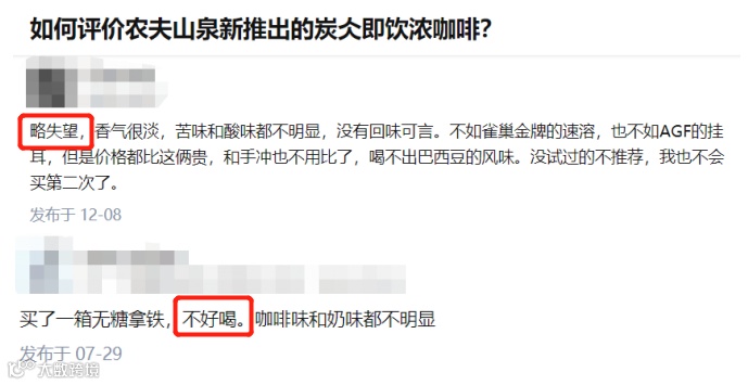 咖啡方面,农夫山泉面临的对手远不止三顿半。今年崛起的咖啡新品牌中,包括永璞、熊爪等在内,都已经逐渐建立起了自己的品牌认知。而农夫山泉的炭仌咖啡尽管尚未披露销售数据,但从部分用户的反馈来看,似乎不太如人意。