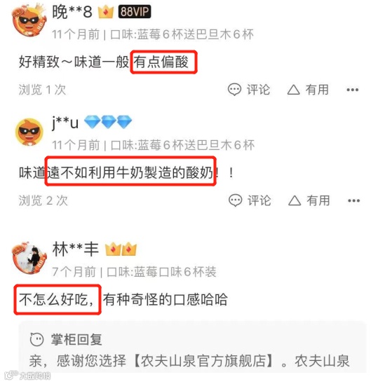 最后是去年农夫山泉的新品植物酸奶。植物酸奶和这两年风很大的植物肉类似,主打的是植物营养。其发酵基底不是我们常见的牛乳,而是大豆、椰浆等植物原料。听起来确实很健康,但其“独特”的口味却很难让人接受。这一点,从其旗舰店的评论可见一斑: