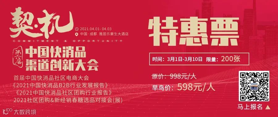 PS:2021年4月1日-3日,由「新经销」举办的2021年(第六届)中国快消品渠道创新大会暨首届中国快消品社区电商大会,将在成都盛大开启。围绕着“新渠道/新渗透;老渠道/新升级”为核心,120+大咖嘉宾,共赴2021上半年快消行业最大盛会!