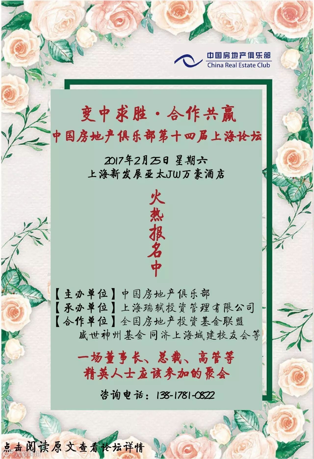 启发企业战略定位、挖掘商机和产生合作机会,这场适合总裁、董事长、CEO及企业创始人参加的高端房地产论坛即将于2017年2月25日(星期六)在上海新发展亚太JW万豪酒店举办