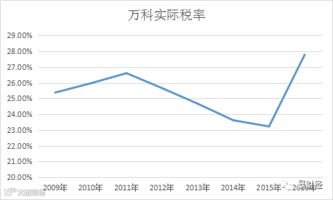 从下面这张图可以看到,万科的实际税率一直以来徘徊在25%左右的水平。实际税率的变化和楼市调控的周期基本是吻合的,即楼市调控趋严的时候,实际税率就高;政策放松的时候,税率就低。