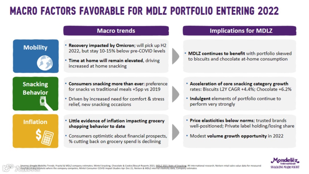 在最后,亿滋国际也对宏观因素进行了分析。其公司提出了三项2022年将影响发展的主要因素,分别为疫情引起的人员流动性减少、食用零食行为增加、以及通货膨胀对消费者购物的影响。