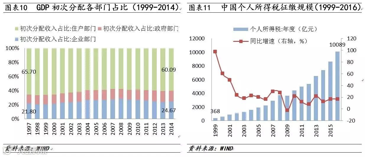 六是中国家庭部门最轻松的税负阶段将迅速成为过往,税收和死亡是必可避免的趋势。和西方国家相比,中国家庭部门的税负是非常轻的,这个基本事实可能许多国人并不认同。中国税制的特点是名义税率重,实际税率不重;所得税地位不重,流转增值等间接税税负过重;企业税负重,居民税负不重、相比工薪阶层,巨富阶层的税负可能更为轻微。过去20年,从GDP初次分配看,企业占20-25%,家庭部门尽管占比下降仍占近60%;但从税收占比看,企业贡献了近70%,家庭部门贡献仅约12%。直到2016年,中国政府征缴的个人所得税也仅刚突破1万亿元。高收入人群的税负过轻和敛财过速是平行的。如果企业税负无法更沉重,那么家庭部门的税负必然显著增加。在未来,涉及个人税负的“三重门”将陆续出现,即遗产税,房产税和更完善的个人所得税。无论如何,家庭部门税负整体过轻,结构失衡的状况无法延续。