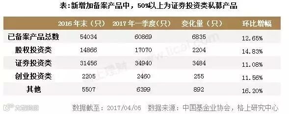 再来看一季度的产品数据,格上统计,2017年一季度新备案产品数6835只,50.97%为证券私募产品。