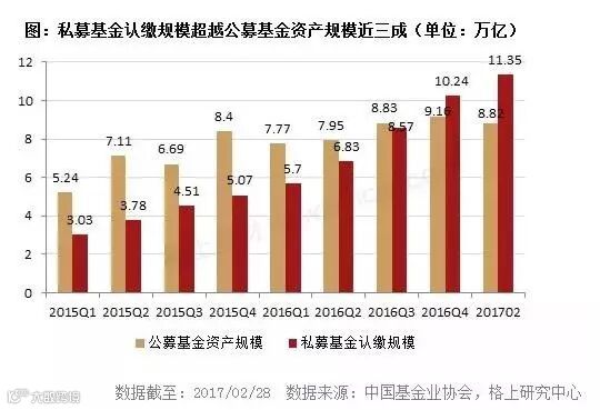 据格上研究中心统计,2015年以来私募基金认缴规模从季度看呈逐步增加态势,并于2016年四季度首次超越公募基金资产规模,而截至今年2月底,私募基金认缴规模已超公募基金资产规模近三成。