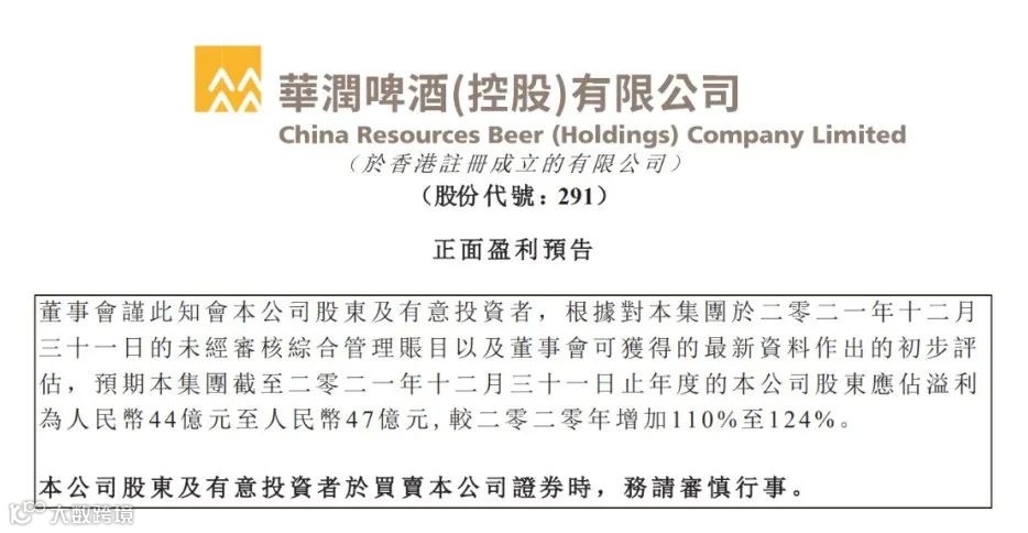 2022年1月26日,华润啤酒(控股)有限公司(以下简称“华润啤酒”)对外发布盈利预告:
