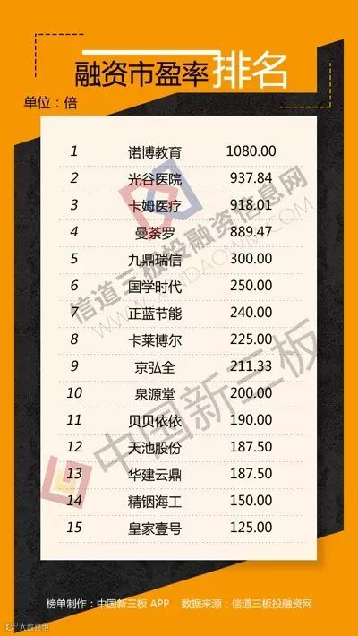 融资市盈率方面,共有20家企业融资市盈率超百倍,其中诺博教育以1080.00倍的融资市盈率居该指标首位,光谷医院、卡姆医疗、曼荼罗融资市盈率在900倍左右;另外,共有65家企业融资市盈率为负,其中如涵控股以-155.53倍排在倒数第三位。