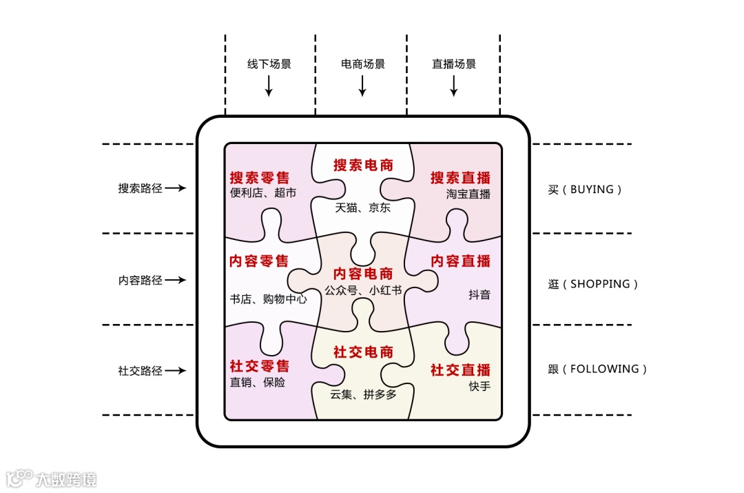 刘润老师之前在公众号内发布过一个图,用搜索,内容和社交三个行为,以及线下,电商和直播三个维度界定了用户的9种购物渠道。