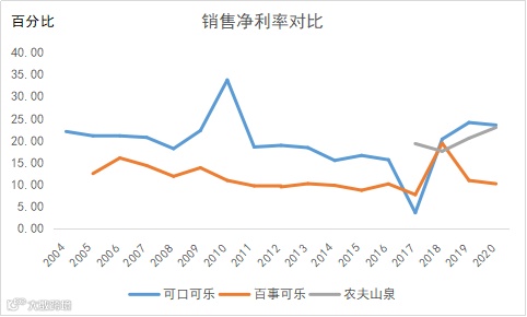 图2:可口可乐、百事可乐、农夫山泉净利率对比