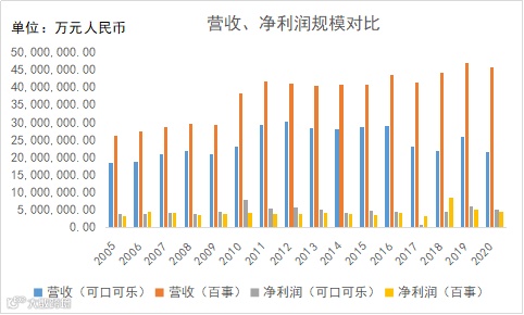 而百事在生产、销售饮料原浆的同时,还要兼顾毛利率不敌饮料的零食业务,因此,相较可口可乐,百事自然会常年呈现“营收规模远超可口可乐,但净利润规模低于可口可乐”的局面了。