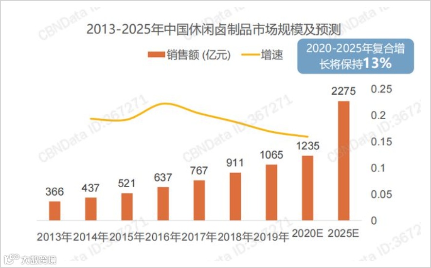 市场预计,到2025年中国休闲卤制品市场规模将达到2275亿元,未来5年的复合增速仍将在13%以上。