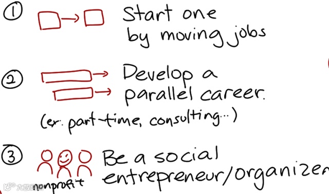 最后一种方法是社会创业。社会创业者通常是在第一职业中非常成功的人士。他们都热爱自己的工作,但是这种工作对他们已经不再有挑战性。在许多情况下,他们虽然继续做着原来的工作,但在这份工作上花的时间越来越少。他们同时开创了另一项事业,通常是非营利性活动。