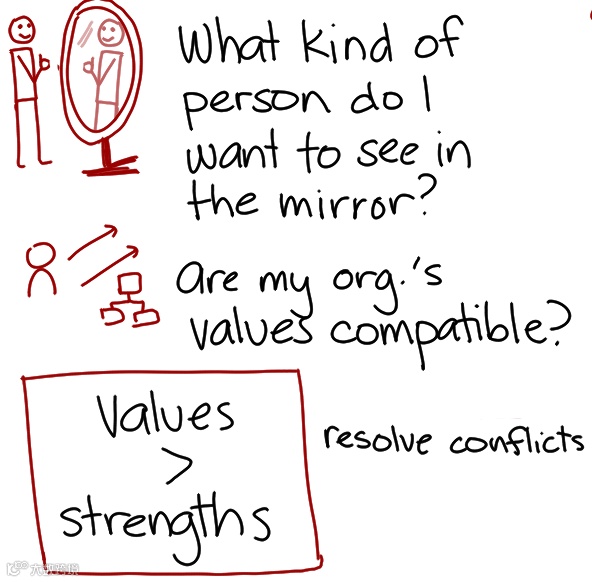 一个人的工作方式和他的长处很少发生冲突,相反,两者能产生互补。但是,一个人的价值观有时会与他的长处发生冲突。一个人做得好甚至可以说是相当好、相当成功的事情——可能与其价值体系不吻合。在这种情况下,这个人所做的工作似乎并不值得贡献毕生的精力(甚至没必要贡献太多的精力)。