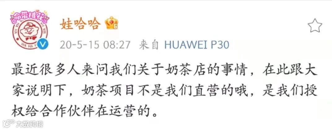 关于娃哈哈奶茶店的经营问题,其实早在去年娃哈哈官博就有声明:“最近很多人来问我们关于奶茶店的事情,在此跟大家说明下,奶茶项目不是我们直营的哦,是我们授权给合作伙伴在运营的。”