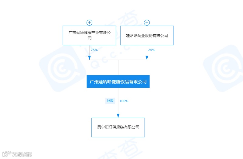 根据企查查数据,广州娃哈哈健康饮品有限公司成立于2019年10月,注册资本200万元人民币,该公司有两大股东,第一大股东为广东冠华健康产业有限公司,持股比例75%;娃哈哈商业股份有限公司为第二大股东,持股比例25%,公司法定代表人为杭州娃哈哈集团有限公司董事长宗庆后。