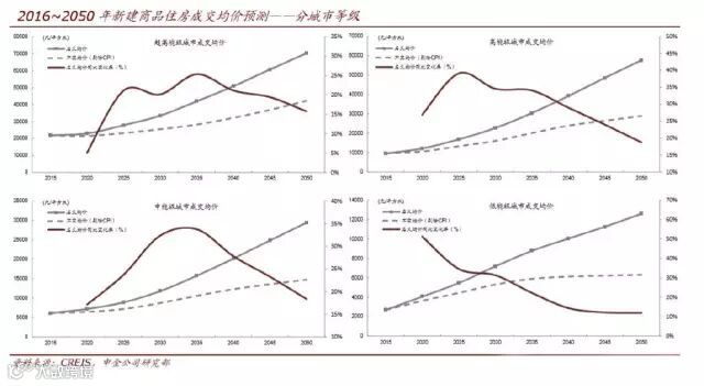 然而,未来全国新房成交金额却将持续走高,预测到 2050 年将会达到 20 万亿人民币左右。各级城市间持续上涨的销售额变动规律基本一致。