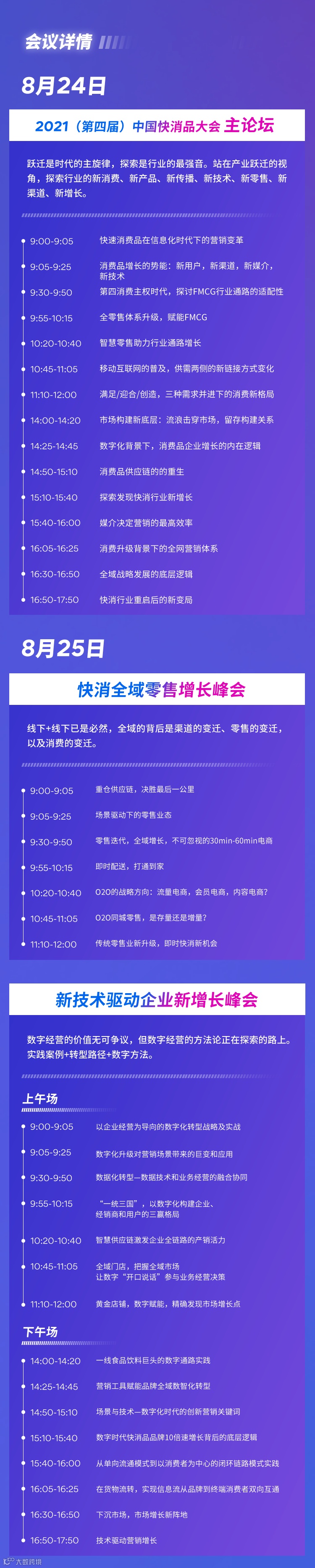 2021年8月24日-26日,由「新经销」举办的2021年第四届中国快消品大会,将在上海盛大开启。围绕着“行业前沿‘集散地’、实践探索‘新案例’、产业对接‘助增长’”为核心,100+大咖嘉宾,3000+快消从业人士,共赴2021下半年快消行业最大盛会!