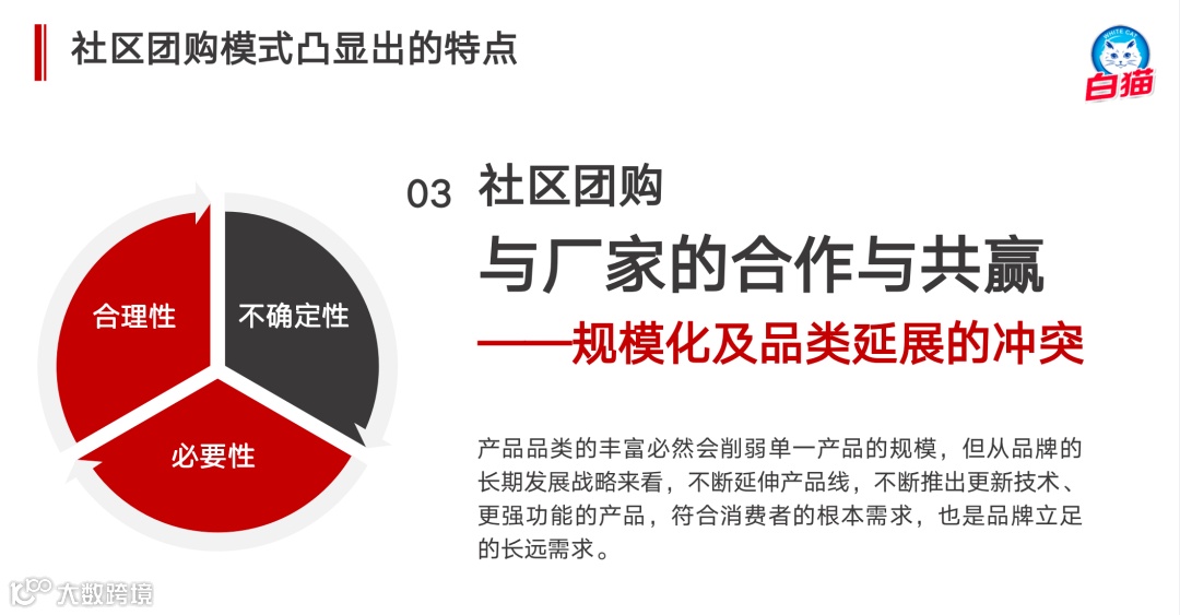 第三,社区团购跟厂家也有一些立场的不同,造成一些行为操作上的冲突。其实,这当中的合作共赢是很容易找到的,对社区团购平台来说一定会有一个成本考量,规模化会带来的产品单一化,这是一个很简单的数学逻辑。但是对厂家来说,更多的品类是看到更加长远的生意机会。对消费者来说更加多的产品品类,更加先进的技术,对消费者有更加多的挑选的前提、动机。