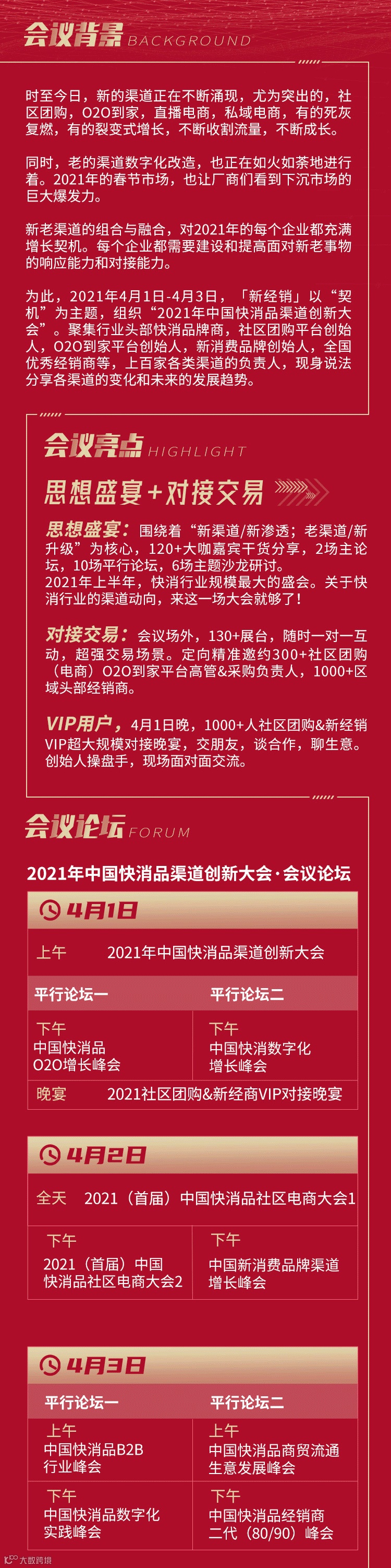 PS:2021年4月1日-3日,由「新经销」举办的2021年(第六届)中国快消品渠道创新大会暨首届中国快消品社区电商大会,将在成都盛大开启。围绕着“新渠道/新渗透;老渠道/新升级”为核心,100+大咖嘉宾,共赴2021上半年快消行业最大盛会!