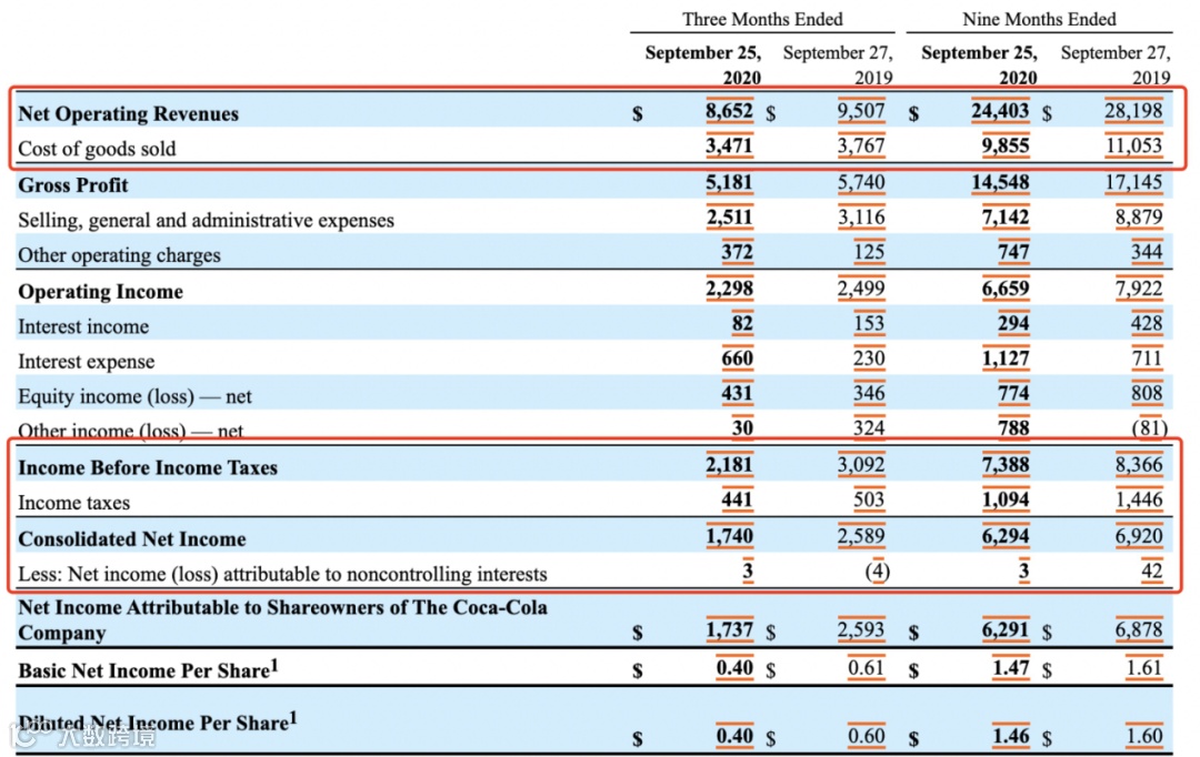 10月22日,可口可乐发布了2020年第三季度财报显示,整体营收超预期。数据显示,第三季度营收为86.52亿美元,同比下降9%;归属公司股东净利润为17.37亿美元,经营利润为22.98亿美元。