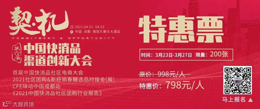 PS:2021年4月1日-3日,由「新经销」举办的2021年(第六届)中国快消品渠道创新大会暨首届中国快消品社区电商大会,将在成都盛大开启。围绕着“新渠道/新渗透;老渠道/新升级”为核心,100+大咖嘉宾,共赴2021上半年快消行业最大盛会!