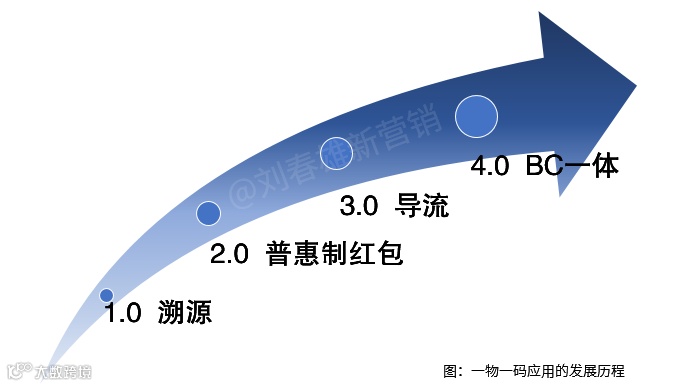 一物一码的应用现在已经升级到4.0。1.0是溯源,如防窜货、防假冒;2.0是普惠制红包;3.0是导流;4.0是BC一体。