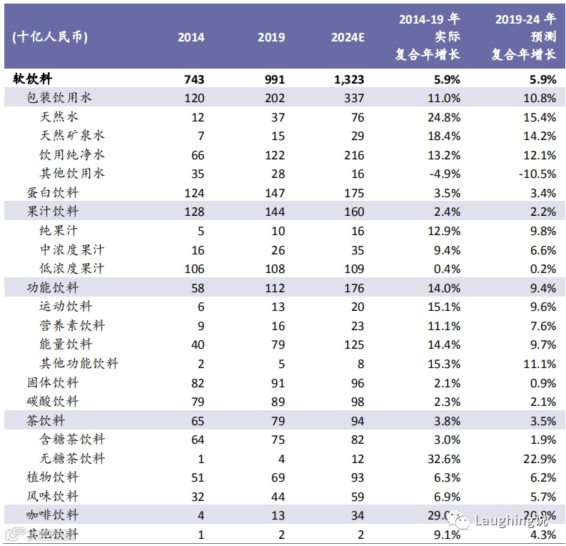 包装饮用水:2019年规模超2000亿,未来5年增速10.8%,到2024年可达3370亿,是软饮市场第一大品类;其中,天然水和天然矿泉水是增长最快的品类,预计未来5年增速15.4%和14.2%。