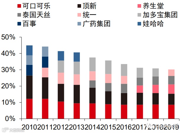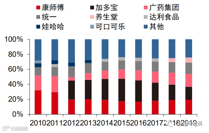 茶饮料现在已经比较集中了,2019年CR5达到75.7%。老大康师傅市占率2011年开始大幅下滑,两大凉茶巨头也开始崛起,现在趋于稳定,加多宝和广药集团(王老吉)2019年合计占比34.3%。