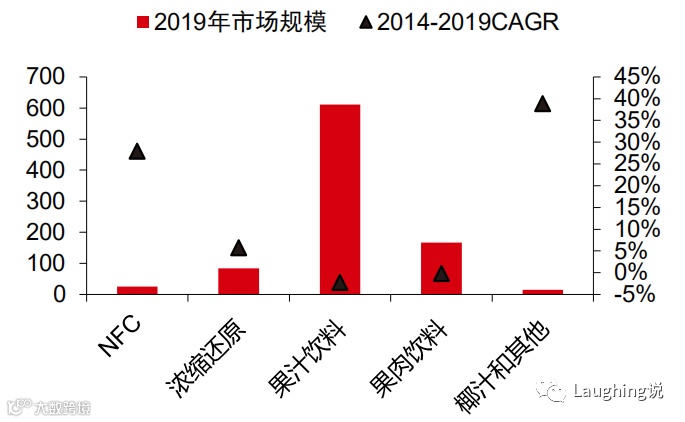 先来看看果汁分类,根据欧睿的分类,有如下几类,现在市场上最多的是低浓度果汁,但基本没增速了,现在增速快的是复合健康生活方向的NFC和椰汁等植物水,2014-2019的CAGR分别为38.9%和27.9%。