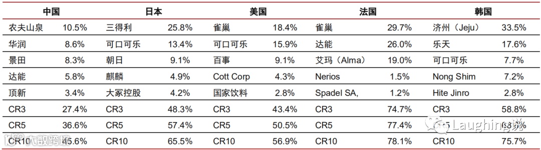 2019年CR3只有27.4%,龙头农夫山泉市占率为10.5%,而日本CR3为48.3%,第一的三得利市占率25.8%,美国CR3为43.4%,第一的雀巢市占率18.4%。