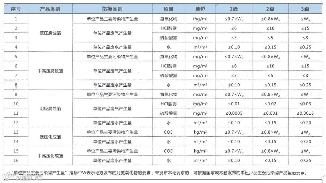 本标准中的铝电解电容器用电极箔(以下简称电极箔),是指经过一种或几种加工处理的作为铝电解电容器电极材料的箔,处理过程包括但不限于腐蚀处理、化成处理或覆盖特殊材料。电极箔是铝电解电容器正负极的主要材料,占铝电解电容器生产耗电成本比例约为50%,同时电极箔生产的腐蚀过程需要大量使用盐酸、硫酸等电解液,在化成过程需要使用磷酸等酸化液体,并排出废水、废气和废渣,面临很大的节能环保压力。