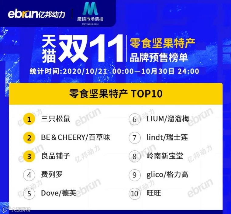 等9个平台类目排名第一;良品铺子销售额为6.59亿元,百草味为5.6亿元。这个销售量级,不知道是多少品牌一整年的任务目标。