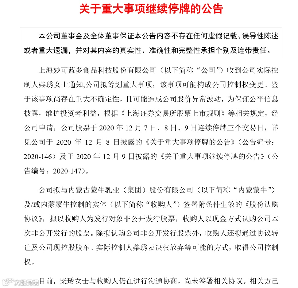 目前,妙可蓝多董事长柴琇与收购人仍在进行沟通协商,尚未签署相关协议。