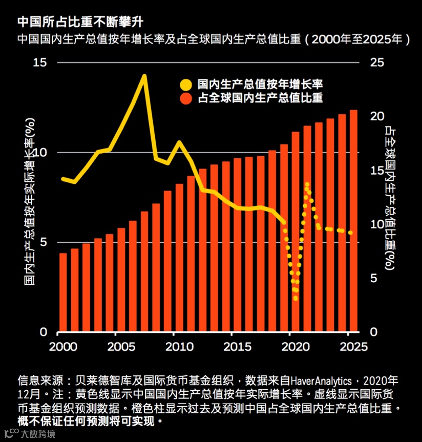 这个趋势已经得到世界公认。据世界顶级战略咨询公司贝莱德智库的预测,到2025年,中国国内生产总值占全球总值比重有望达到20%。从下图可见,2020年是比重提升的关键之年。
