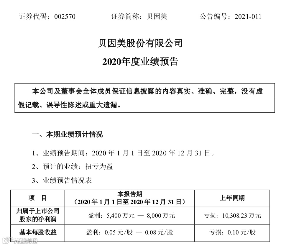 根据贝因美今天发布的未经注册会计师预审计的业绩预告,该公司在面临疫情挑战的2020年预计扭亏为盈。