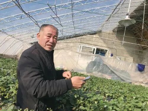 初春的阳光透过塑料膜洒在每一片绿叶上。村委委员、主管草莓园区的王化宝在自家的棚内一边观察草莓的长势,一边点开手机软件察看棚内的温度。