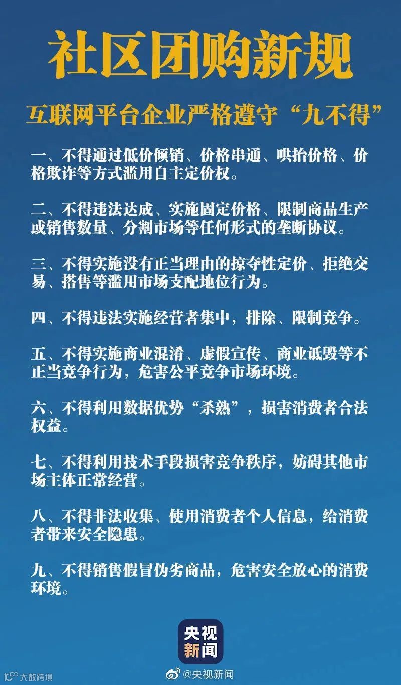 不只是供应商,2020年12月,市场监管总局联合商务部组织召开规范社区团购秩序行政指导会,阿里巴巴、腾讯、京东、美团、拼多多、滴滴等6家互联网平台企业参加。会议指出当前社区团购存在的低价倾销及由此引起的挤压就业等突出问题,并要求互联网平台企业要严格规范社区团购经营行为,严格遵守“九个不得”:不得低价倾销、不正当竞争等行为。