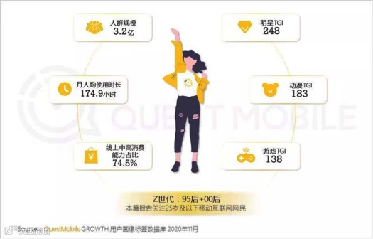 根据QuestMobile近日发布的《2020年Z世代洞察报告》,Z世代由95后+00后组成。2020年11月,中国移动互联网Z世代活跃设备数近3.25亿,相比2016年同期的1.66亿,5年时间规模增长近乎翻倍,Z世代已经成为移动互联网民中的新势力。